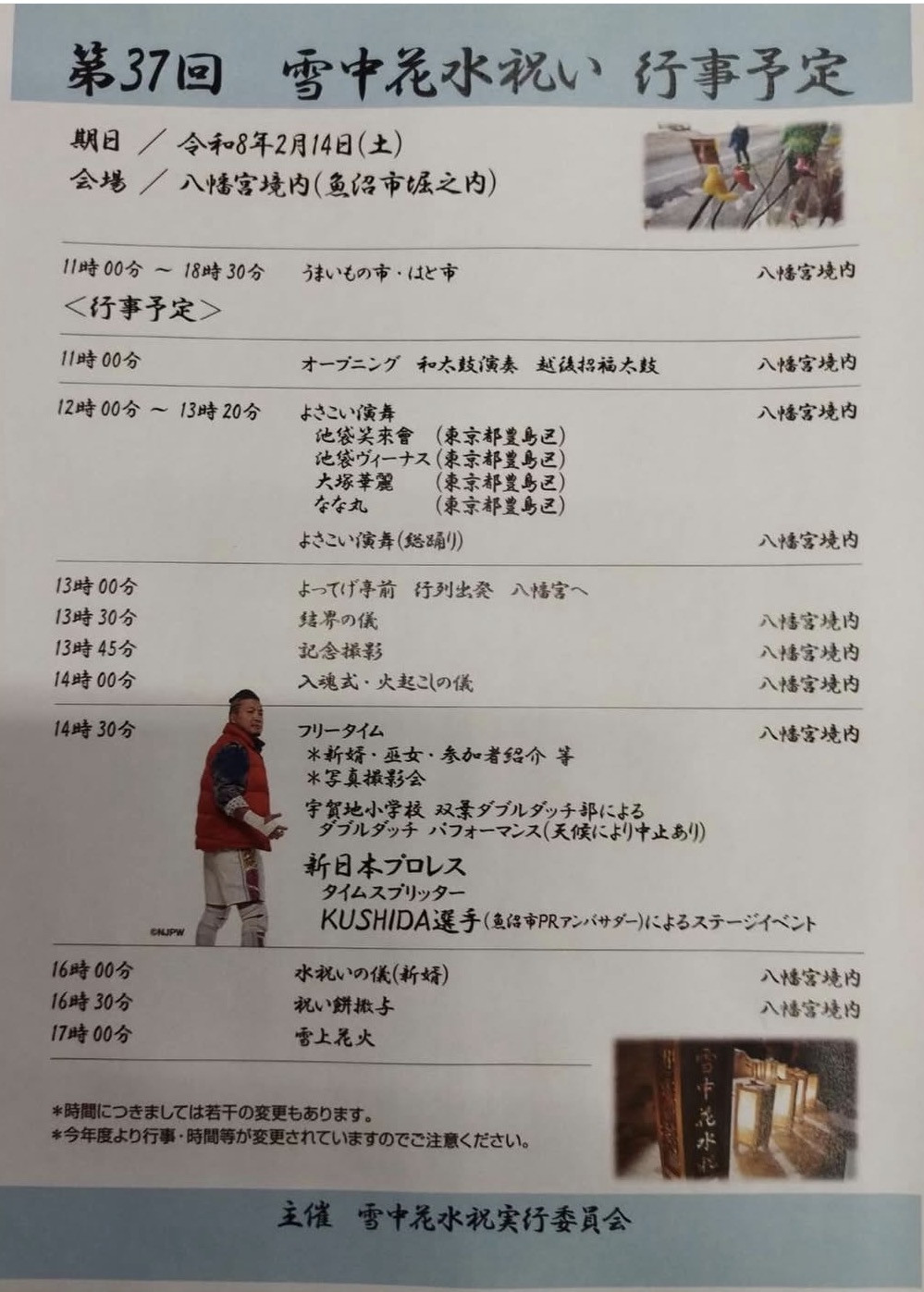2026年2月14に開催される雪中花水祝の予定表を公開いたします。